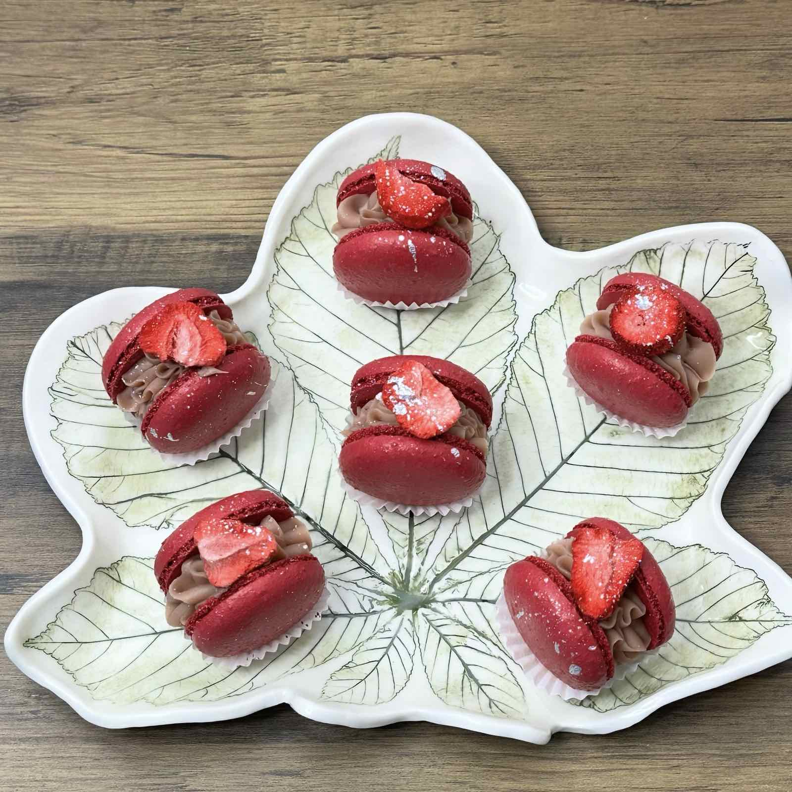 Double Strawberry is the perfect macaron for true strawberry lovers. Each piece features crisp red shells with a soft, chewy centre, filled with a smooth strawberry-infused chocolate cream. On top, an extra layer of crunchy freeze-dried strawberries enhances the aroma and adds a natural, refreshing tartness.