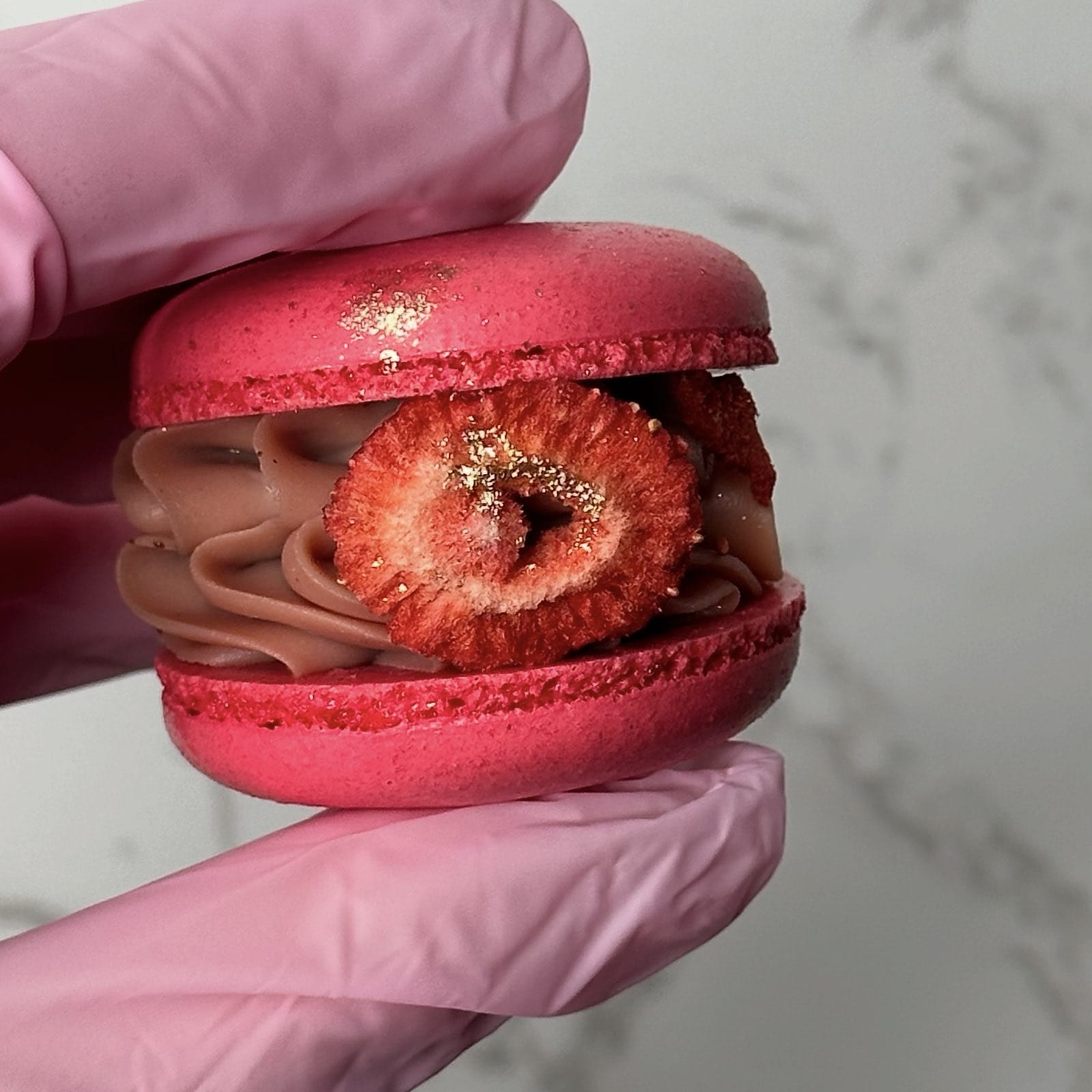 Double Strawberry — vibrant red macarons filled with silky strawberry-chocolate cream and topped with extra freeze-dried strawberries. Juicy, bright, and full of real berry flavour.